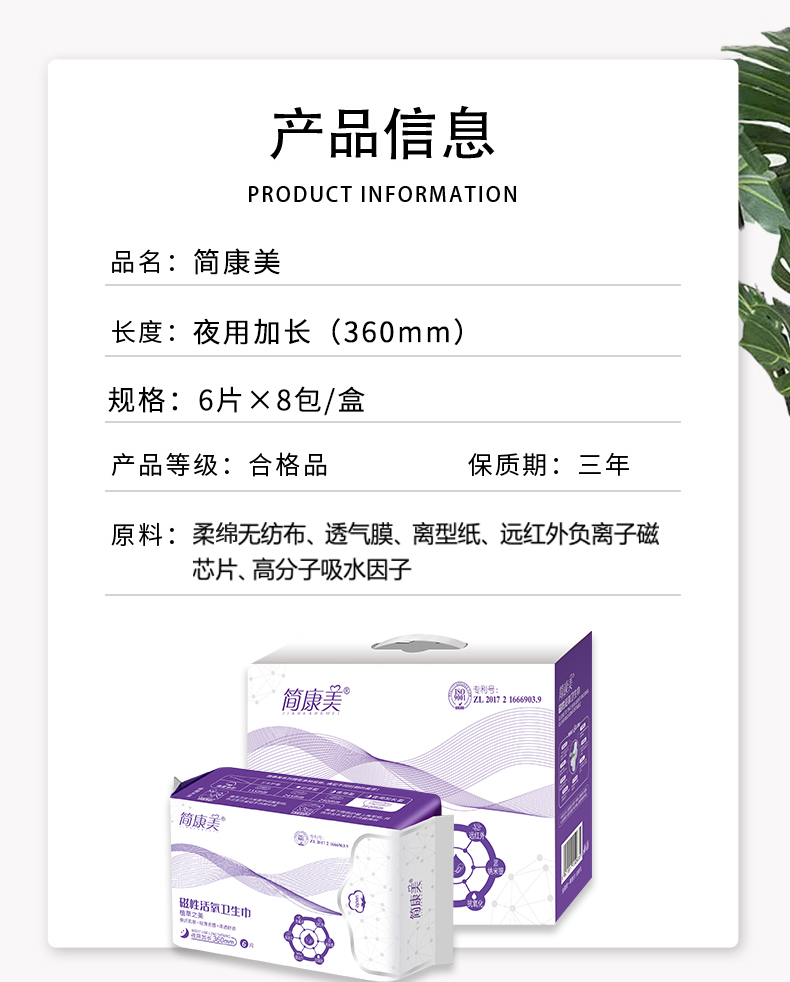 商品名称:简康美磁性活氧卫生巾(夜用加长)